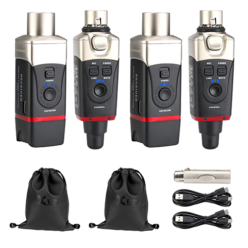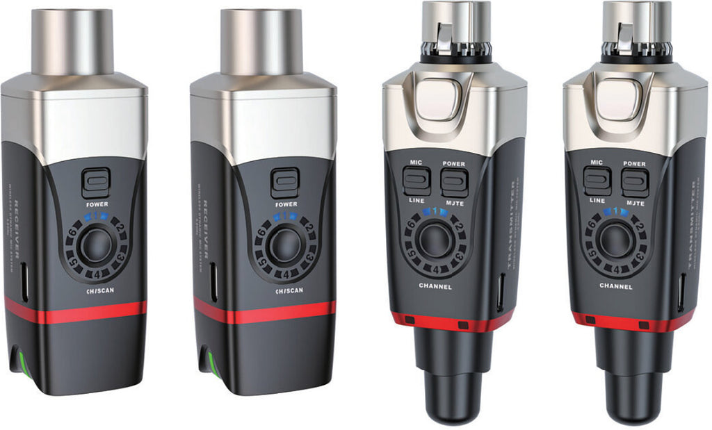 If you have a small mono system with only one loudspeaker, you only need one U35 set, connecting the Transmitter to the mixer’s mono XLR output, and the Receiver to the powered loudspeaker’s XLR input. But you can create a dual mono setup by connecting a Transmitter to the mixer’s output, connecting U35 Receivers to the XLR inputs of two powered speakers, and setting all three units to the same channel. That way, both speakers get the same mono signal. In fact, one U35 Transmitter can transmit to more than two Receivers—so you can create a multiple mono setup by sending the same mono signal to three or more powered cabinets or monitors! You will just need as many U35 Receivers as you have speaker cabinets.